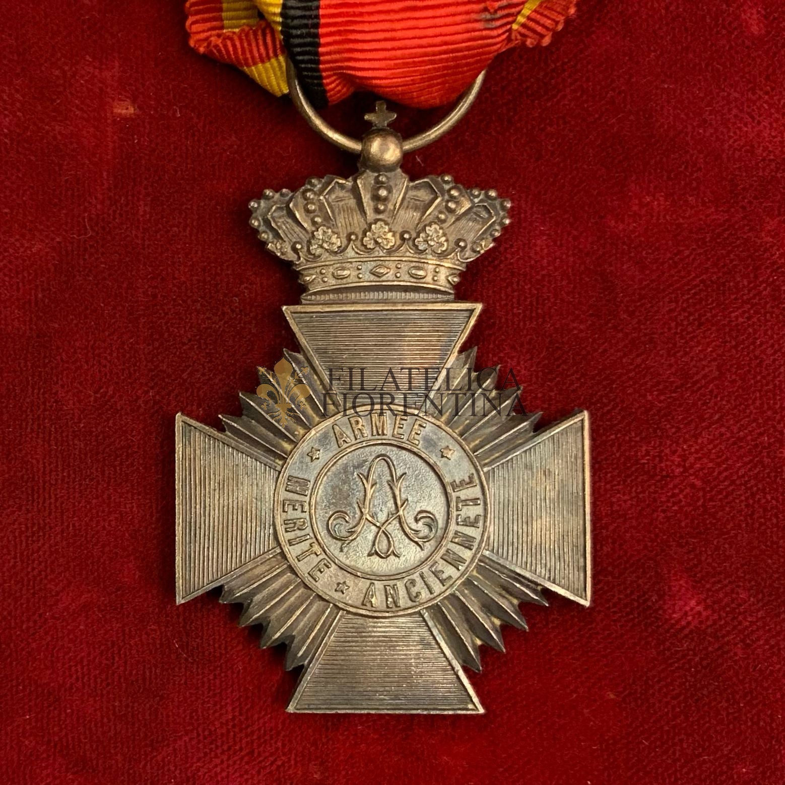 Verso: nel medaglione centrale è rappresentato il monogramma reale del monarca regnante al momento dell'assegnazione. Legenda circolare "ARMEE * MERITE * ANCIENNETE"