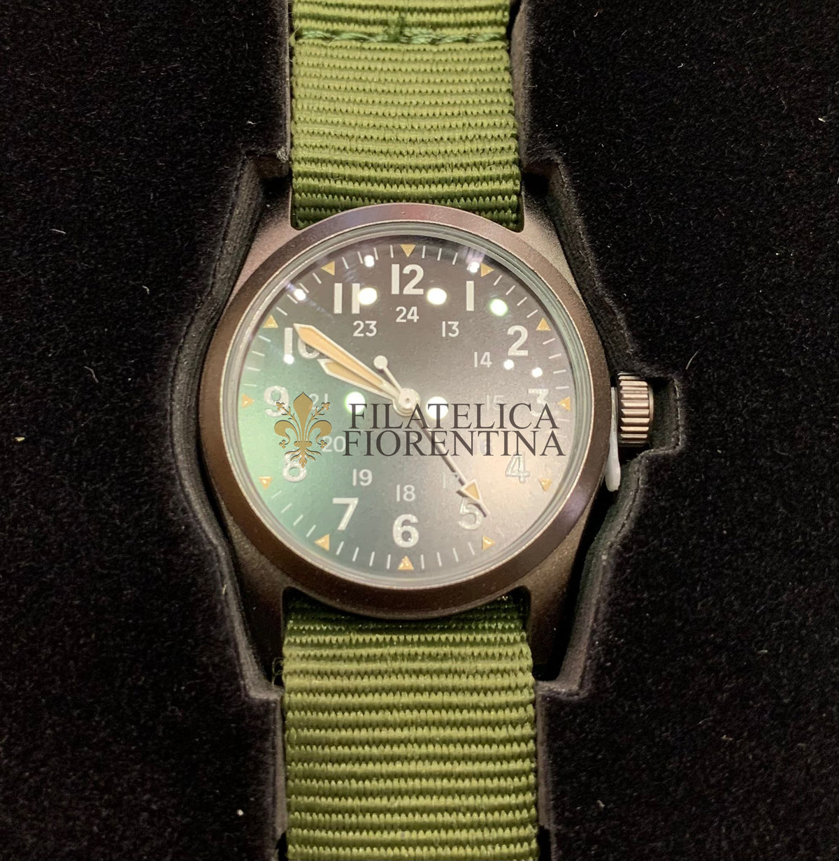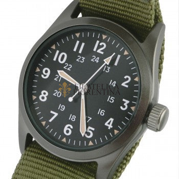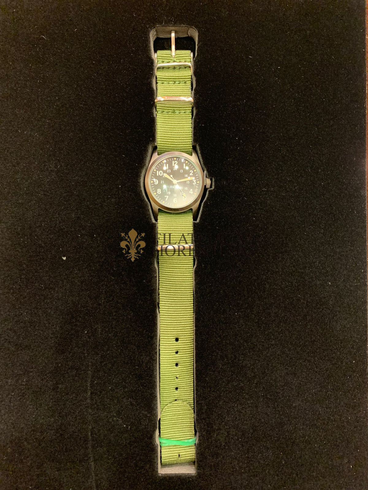 Un cinturino da polso verde oliva da 25 cm, tenuto in posizione da barre a molla.