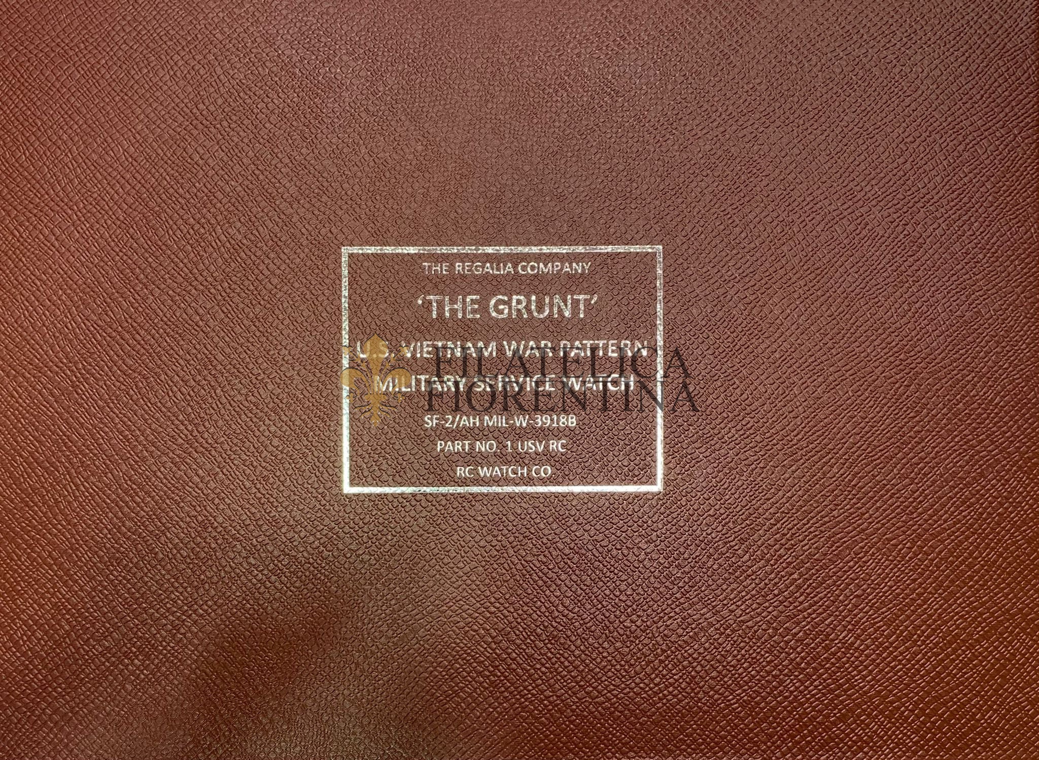 Una scatola di presentazione piatta marrone con testo argentato.