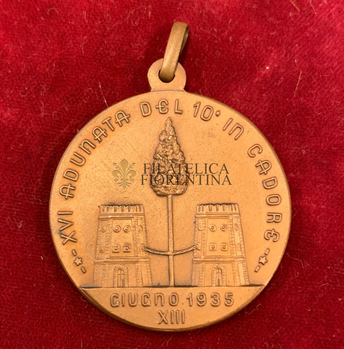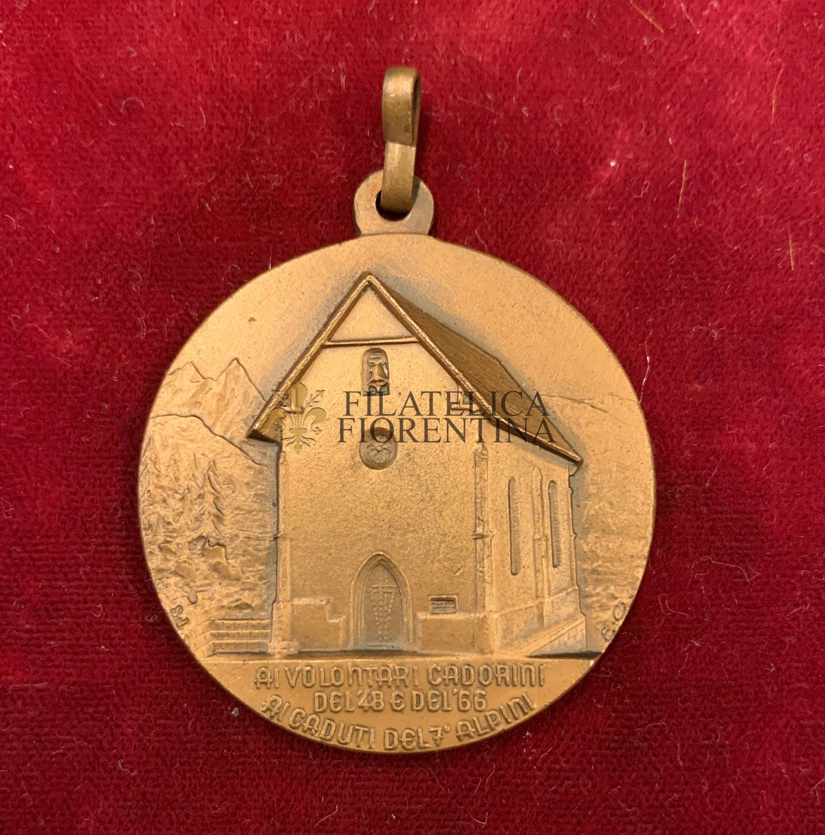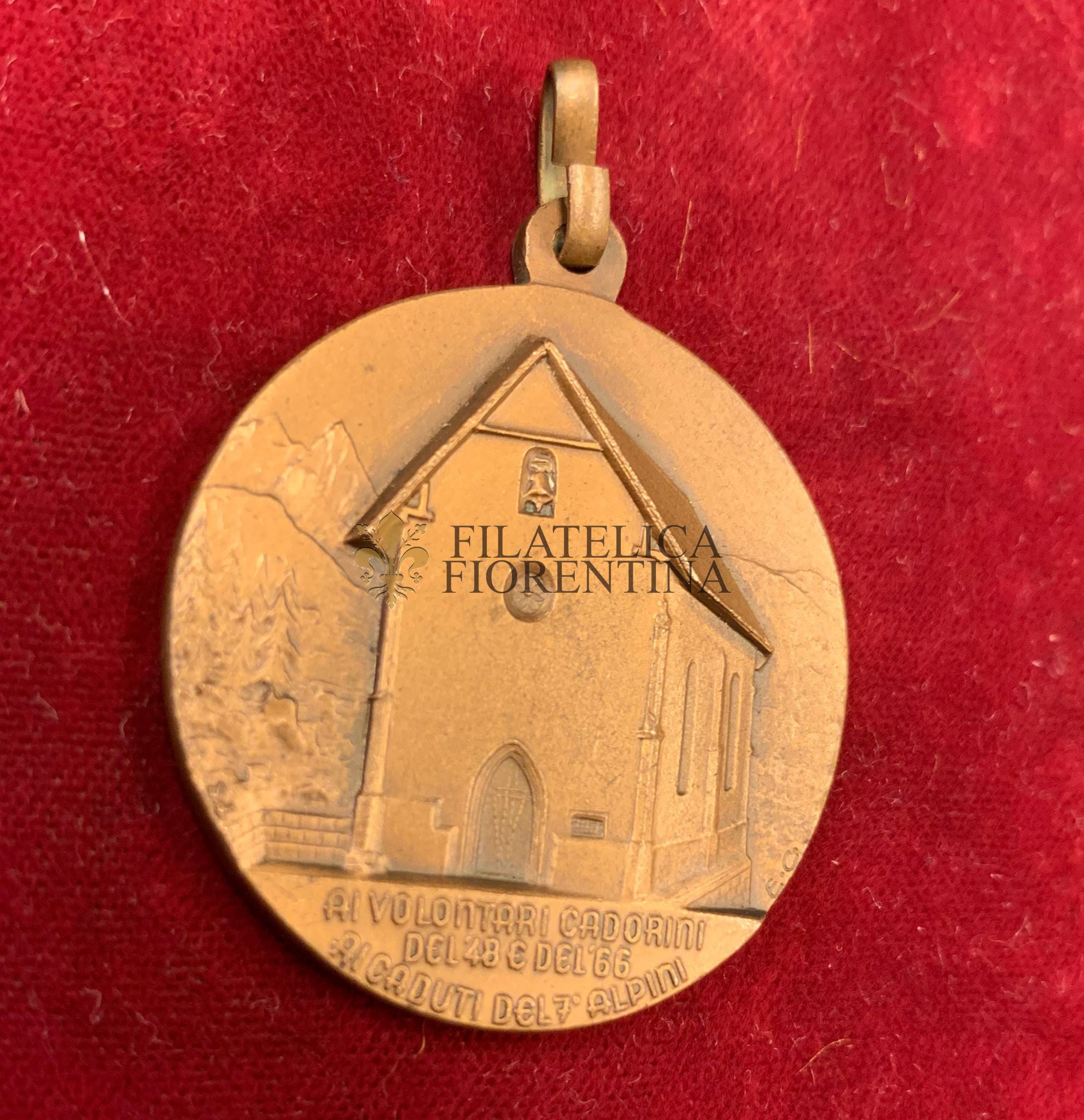 Sul D/ : Chiesa di S. Francesco d'Orsina, a Calalzo, dedicata ai Volontari Cadorini del 1848 e del 1866 e ai Caduti del 7° Reggimento Alpini. La piccola campana è dono della città di Bologna.